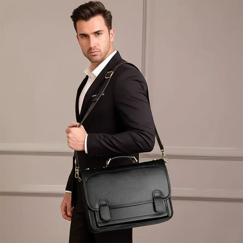 این کیف دارای بند دستی چرمی و بند دوشی چرمی قابل تنظیم است که حمل کیف را راحت و انعطاف‌پذیر می‌کند. بند دوشی قابل تنظیم به کاربر امکان می‌دهد کیف را روی شانه یا به صورت کراس‌بادی حمل کند، در حالی که بند دستی کلاسیک امکان حمل کیف با دست را فراهم می‌کند. این طراحی چندکاره کیف را برای استفاده روزانه و جلسات رسمی بسیار مناسب کرده است.